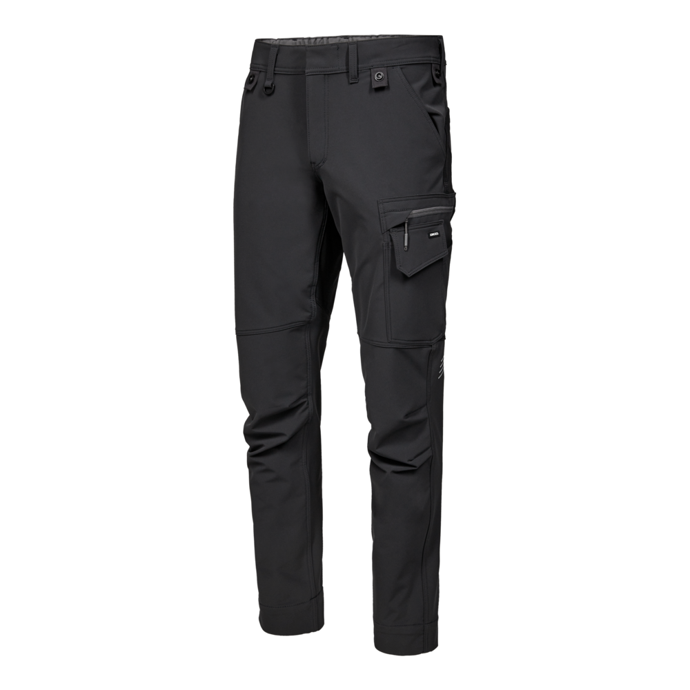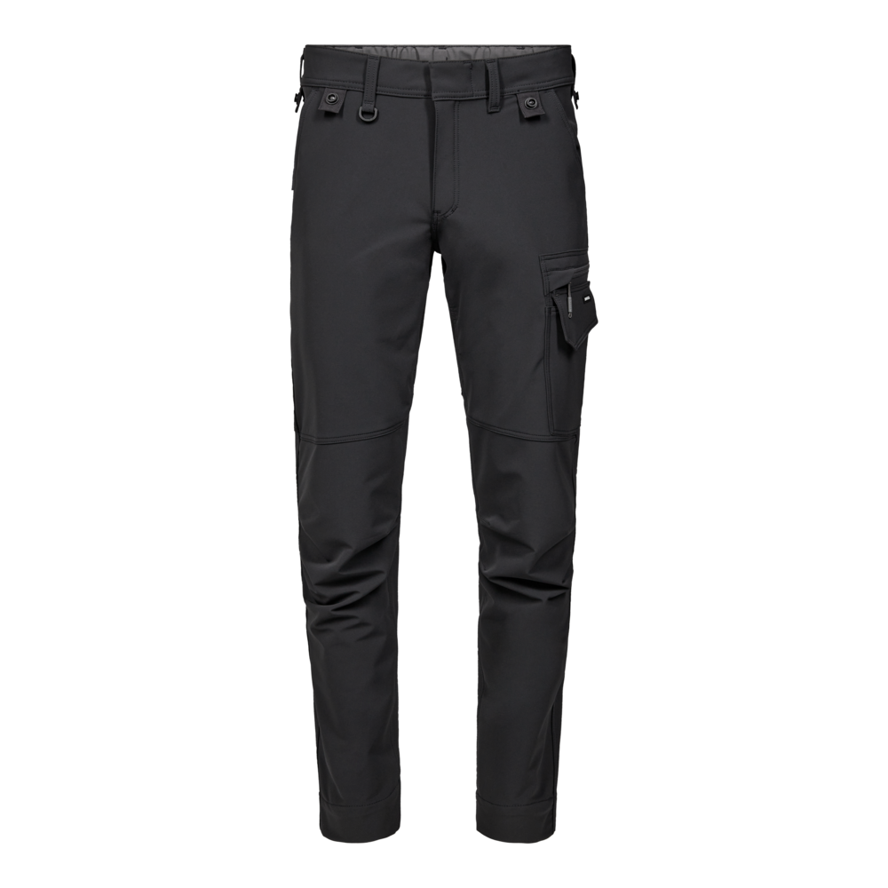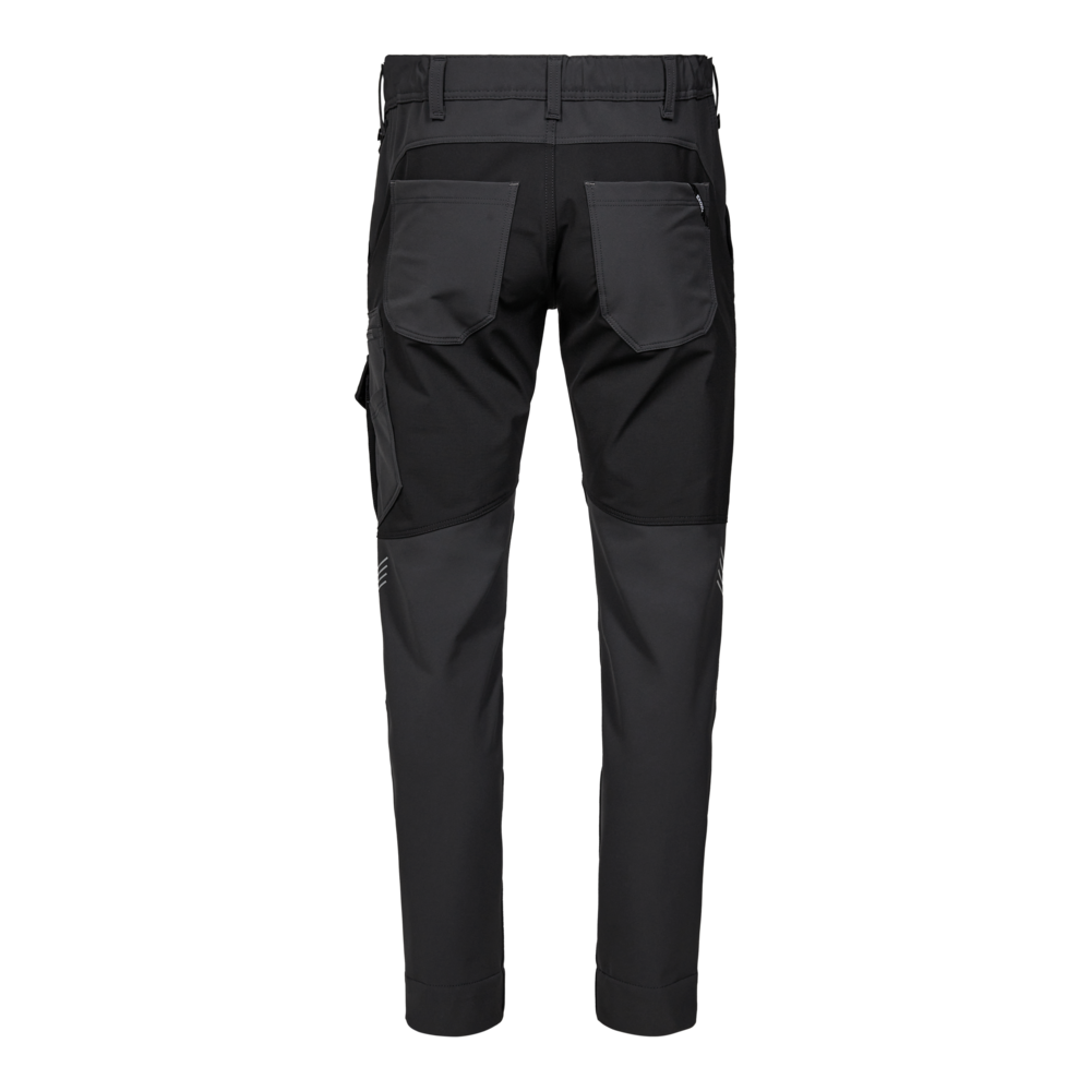 Ove službene hlače dizajnirane su s naglaskom na funkcionalnost, izdržljivost i udobnost. Izrađene su od udobnog materijala rastezljivog u 4 smjera koji pruža povećanu fleksibilnost, dok Ripstop tkanina u kontrastnoj boji osigurava izdržljivost i moderan izgled. Skriveno zatvaranje na gumbe štiti površine od ogrebotina, a elastika na stražnjem dijelu struka osigurava optimalno pristajanje, čak i tijekom kretanja. Postoje mnogi funkcionalni džepovi za dodatnu pohranu, uključujući džep na bedru s patentnim zatvaračem i namjenski džep za mobitel na lijevom bedru. Osim toga, tu su i pričvršćeni gumbi za brzo pričvršćivanje visećih džepova za alat. Praktična traka s D-prstenom omogućuje sigurno i jednostavno pričvršćivanje predmeta poput osobnih iskaznica. Hlače također imaju ekstra široki rub, koji omogućuje produljenje duljine nogavice do 6 cm, ili 4 cm za kratki struk, kako bi se prilagodile različitim potrebama. Reflektirajući print na stražnjoj strani koljena povećava vidljivost, posebno u tamnijim okruženjima. Glavni materijal je obojen postupkom bojenja u dope tehnici.- Izrađeno od udobnog 4-smjernog rastezljivog materijala za povećanu udobnost